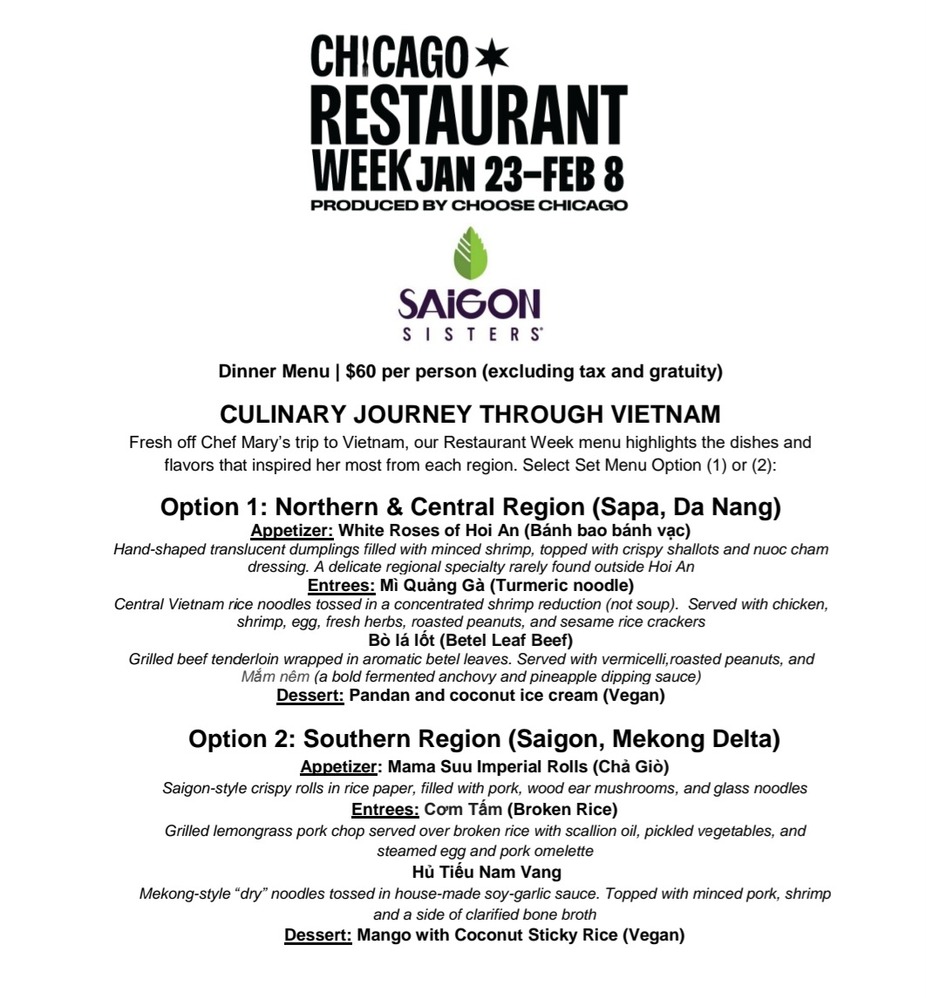 Chicago Restaurant Week returns Jan 23–Feb 8. We're excited to bring you an exclusive menu inspired by Chef Mary’s recent travels through Vietnam featuring regional specialties that are rarely found and expertly crafted in-house. This year’s dishes are also a heartfelt tribute to Mama Suu, marking one year since her passing, and spotlighting flavors from her hometown near Hoi An. Each dish tells a story—of family, roots, and the traditions that live on through food. Book your table today!